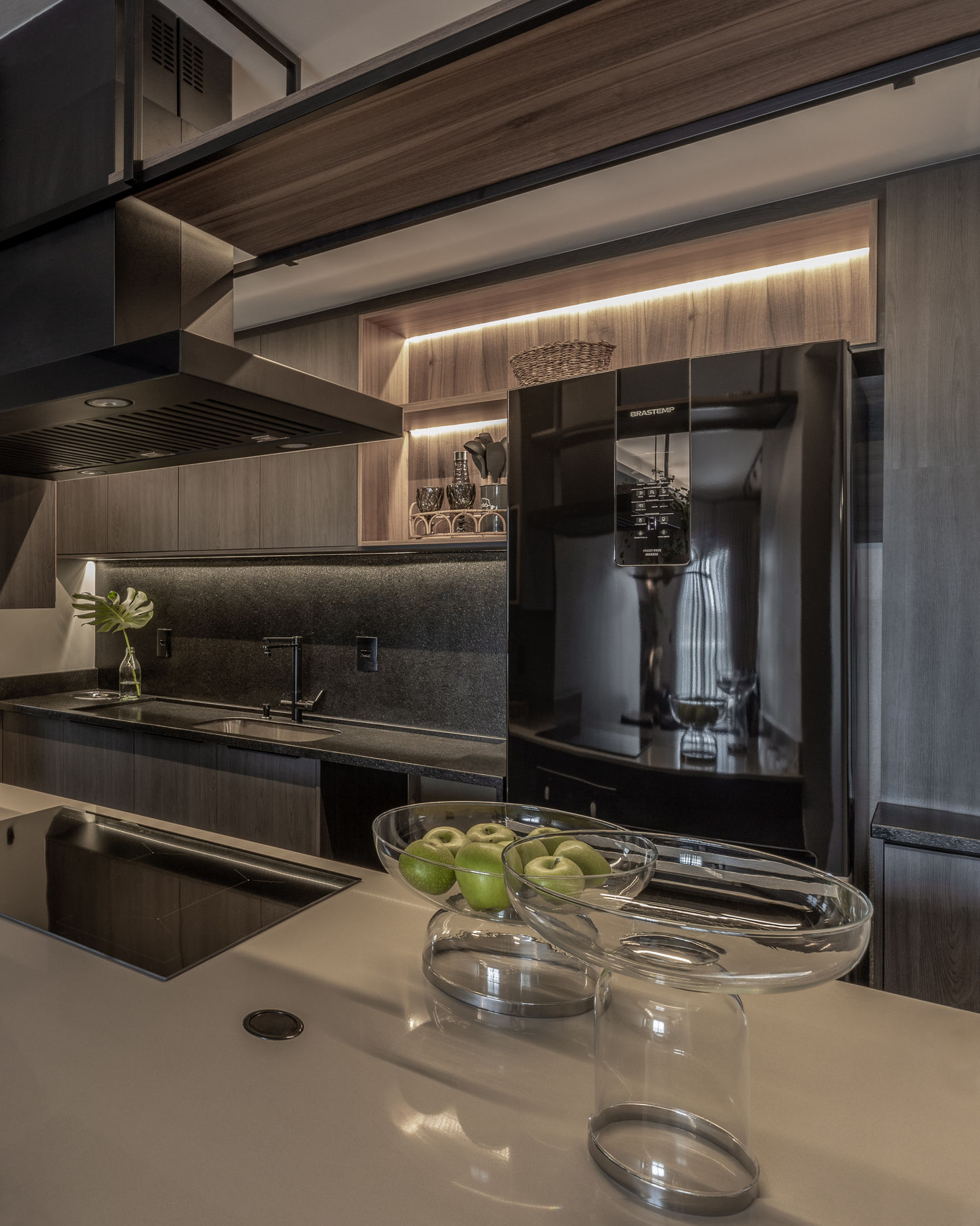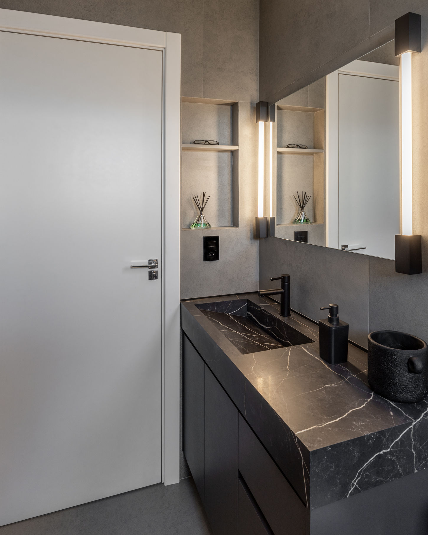 As escolhas de materiais — tons escuros e pedras naturais — não ficaram restritas à suíte. Elas se estendem por todo o apartamento, criando uma identidade sofisticada e acolhedora, em total sintonia com o estilo do morador.