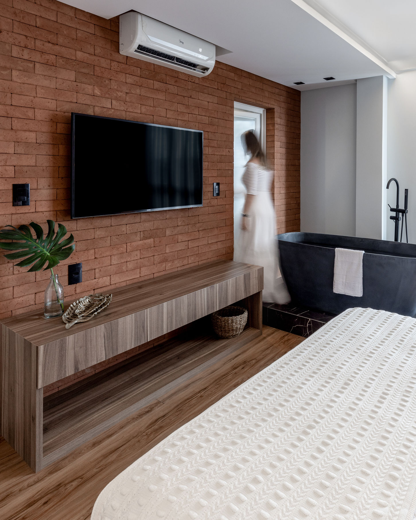 Transformação e personalização! Neste projeto, adaptamos um apartamento já pronto para incorporar um desejo especial do morador: uma banheira de imersão no quarto.
